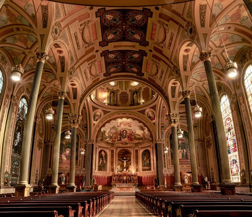 The columns in Mother of God Church serve a structural purpose in holding up the trusses and roof of the church. In addition, they are ornamental. Manufactured in Covington, the columns are made of iron and covered with gold leaf. The columns in the nave are topped by capitals in the Corinthian style. Two columns, at the juncture of the transept and the nave, have massive composite capitals, combining the Corinthian and Ionic styles. The two small columns under the choir loft near the entrance of the church were from the first 1842 church building. Along with some of the bricks used in construction of the present 1870-71 church, they are the only surviving remnants of the first church building. [Source: p. 96, Mayor's Guide: Mother of God Church]