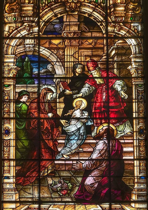 Scripture does not tell us of the presentation of Mary, but early non-Biblical writings do give us the story. When Mary was still a young girl (stories differ at what age) Joachim and Anne, her mother and father, brought her to the Temple, and she was presented to the High Priest, consecrating her life to God. One of the windows on the Eastern side of Mother of God Church shows her going up the steps of the Temple to the High Priest. Her parents are there with her.