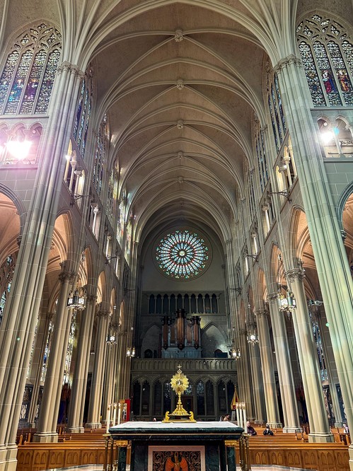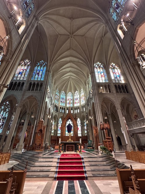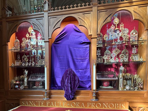 East- and west-facing views of the Cathedral Basilica of the Assumption; A case filled with relics of the saints.