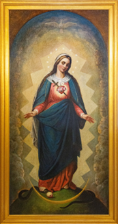 Please note the large painting in the sanctuary this Sunday. It was painted by Johann Schmitt and was originally in Mother of God School. It is titled, Our Lady of Sorrows or the Immaculate Heart of Mary. When the school was torn down, it was given to Vic Canfield for safekeeping. Last year, he had the painting restored and has now donated it back to Mother of God Church, in memory of Rick Sacksteder. It will be kept in the pipe organ gallery, opposite of another Johann Schmitt painting, the Visitation of Mary to Elizabeth.