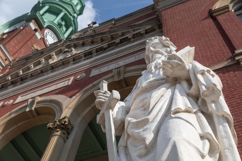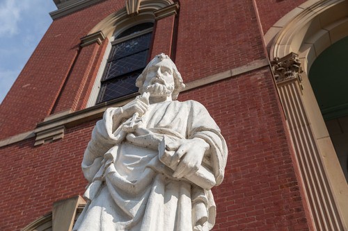 In Christian symbology, Peter is always portrayed holding the keys, and Paul is shown holding the sword, by which he was executed. We have two large statues in front of Mother of God Church of these two great saints.