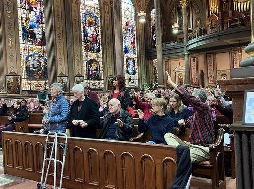 Members of the Prayer Team listen as Fr. Comer says a blessing over them during the Sunday 11:30 am Mass.