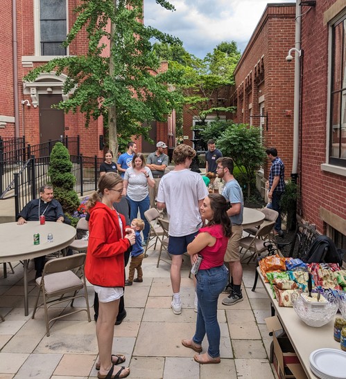 There were lots of laughs and great food shared on Wednesday, May 29, at the Young Adult Group's grill out with Bishop John Iffert. The event was held in the courtyard between the church and the St. Aloysius Center. Those in attendance enjoyed metts and hot dogs, as well as other side dishes.